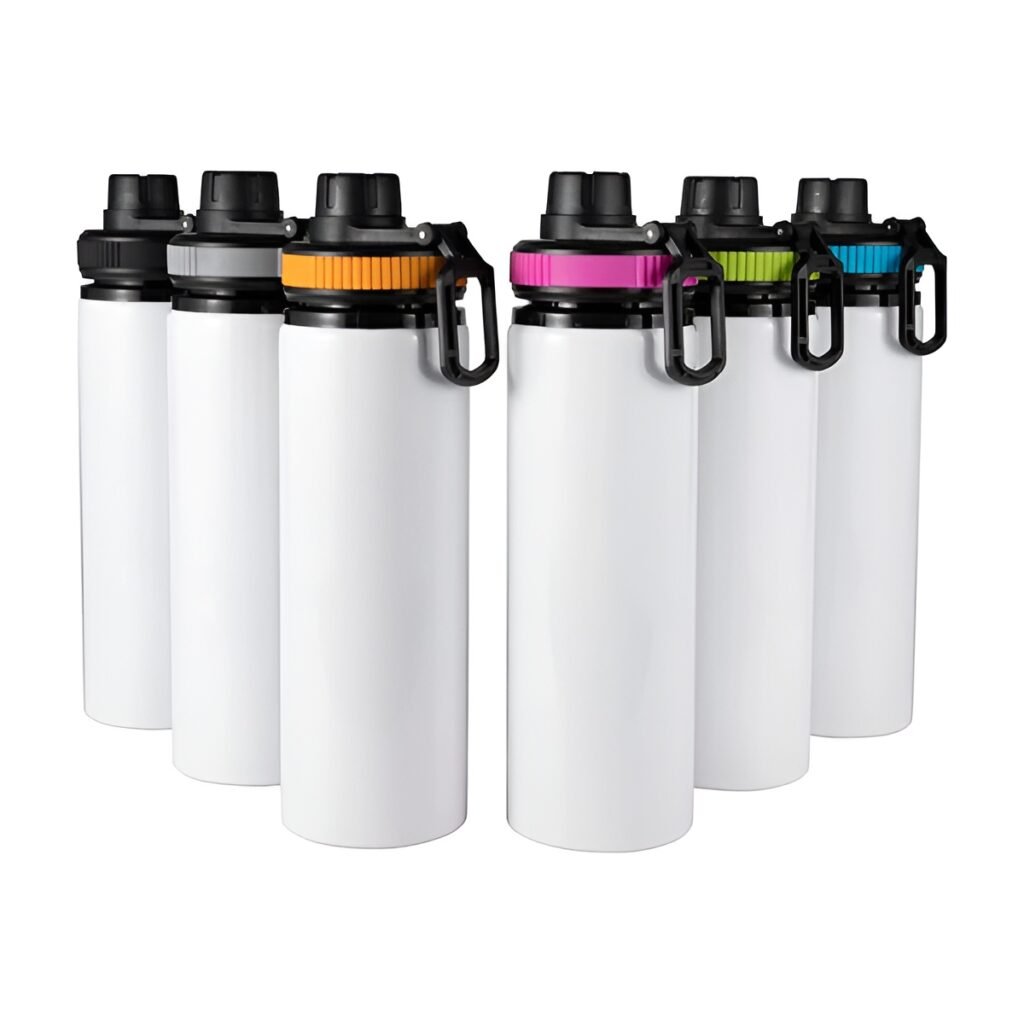 Personalización de botellas con doble botón, cómodas y seguras para actividades deportivas.